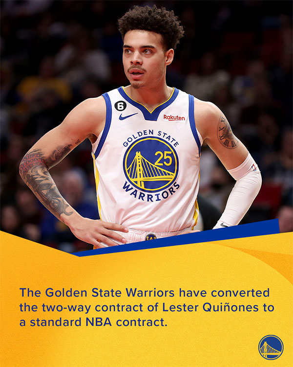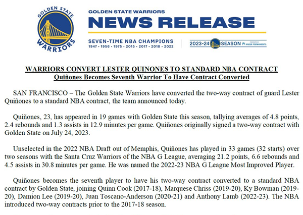 勇士官宣把基诺内斯的双向合同转为一份NBA正式合同。