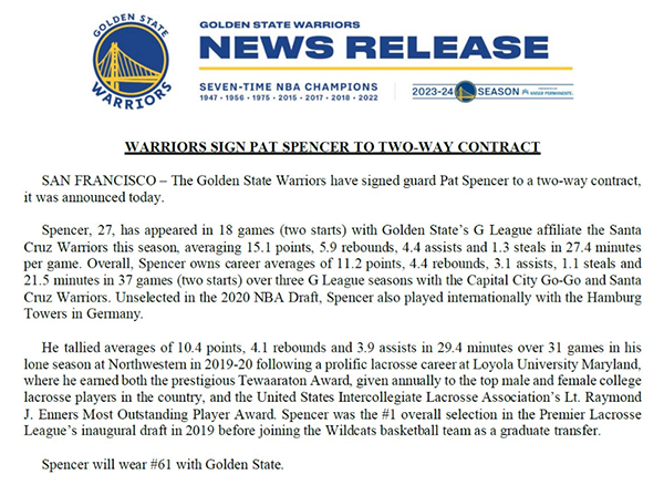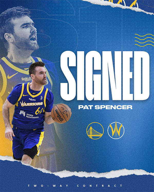 基诺内斯正式转正后,勇士官宣用空缺的双向合同签下帕特-斯宾塞。