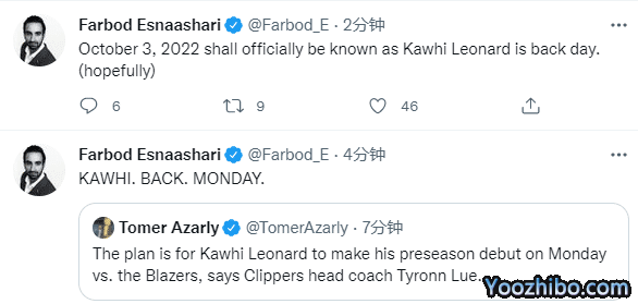 178直播10月01日讯 ,NBA季前赛已经开打,在快船新赛季第一场季前赛之前,快船主帅泰伦-卢宣布科怀-莱昂纳德将在下一场对阵开拓者的比赛中伤愈归来,因此小卡伤愈复出首战的时间确定,3天后正式重返赛场;沃尔也将在这一场比赛中回归。