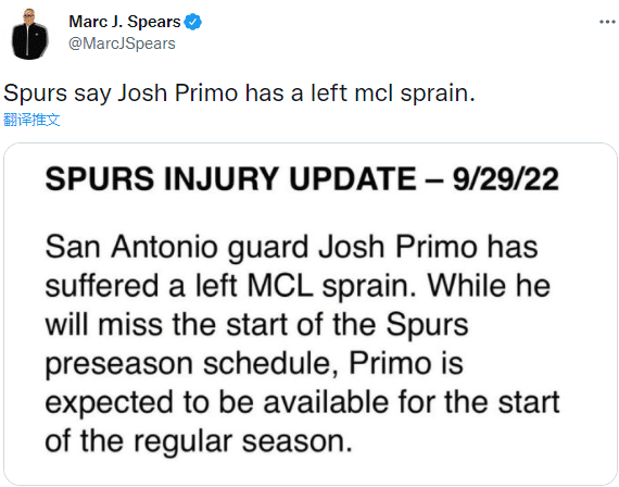 178直播09月30日,马刺官方宣布,球队二年级后卫约什-普里莫在训练营中遭遇左膝内侧韧带扭伤,将至少缺席初段的季前赛,他的伤势并不算严重,马刺预计普里莫将在常规赛初期复出。