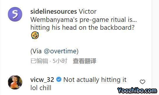 美媒写道:“文班亚马的赛前习惯竟然是用他的头来砸篮板?(笑哭表情)”有趣的是文班亚马本人在评论区现身回复:“事实上并没有撞到,哈哈。”