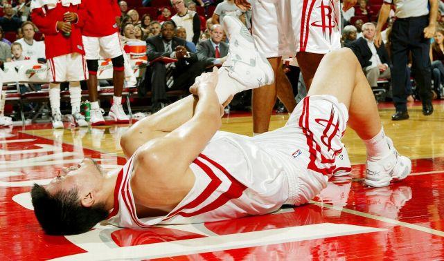 姚明身高2米26,虽然生涯前两季都打满82场,但从第4季开始遭遇严重伤病,最终只在NBA打了8年,生涯场均19分9.2篮板1.9盖帽。