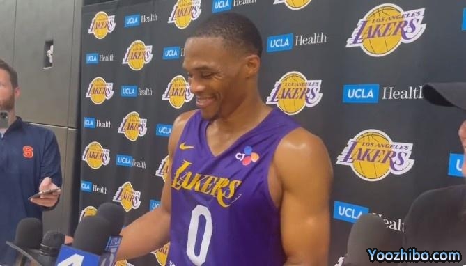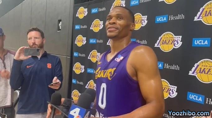 记者问湖人主教练哈姆威少新赛季会首发吗?哈姆回答:绝对的,威少今天在前锋和中锋位置,表现很好,他带来了很多能量。