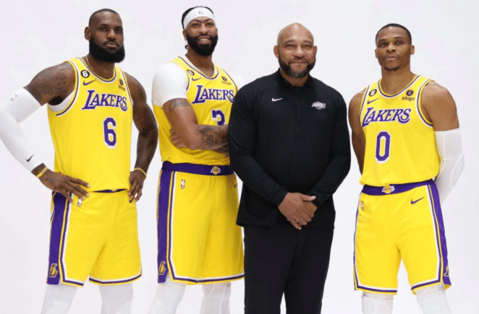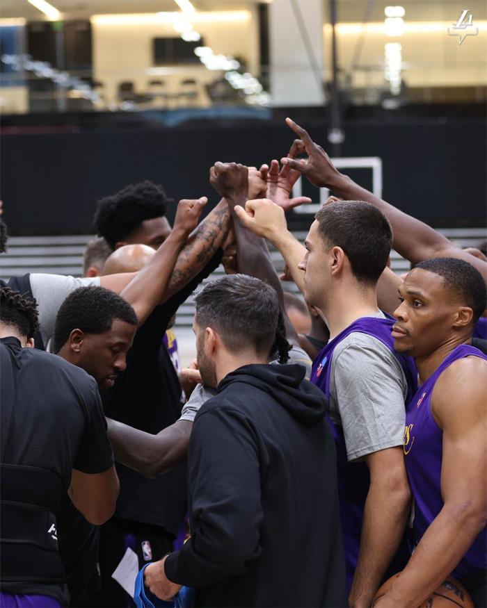 178直播09月28日,洛杉矶湖人队正式举办训练营,首日训练之后湖人官方晒出训练照,配文写道:训练营第一天;浓眉单挑詹姆斯,两大巨头的表情抢镜;威少抱球目视远方,加布里埃尔满脸笑容,训练之后众球员围在一起击拳加油。
