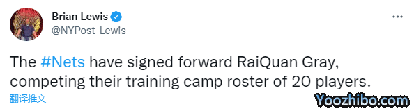 178直播09月27日,据名记Brian Lewis报道,篮网已经签下前锋雷匡-格雷,双方签下一份训练营合同;篮网训练营20人大名单出炉,杜兰特、欧文和西蒙斯新三巨头领衔15+2冲冠阵容。
