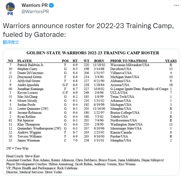178直播09月27日,勇士官方正式宣布和伊戈达拉续约,一哥回归再战最后一年,新赛季结束后他将会退役;勇士新赛季20人训练营大名单正式出炉,库里克莱领衔14+2卫冕阵容。