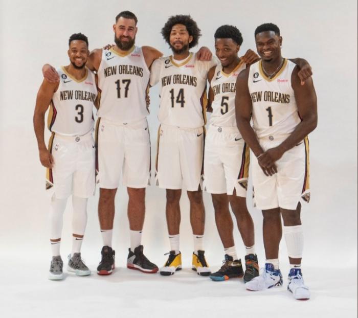 鹈鹕五大核心合影,英格拉姆站在C位邋遢造型太抢镜,锡安和CJ都是站在两侧,咧嘴大笑十分开心;瓦兰丘纳斯和赫伯特-琼斯同样满脸笑容。