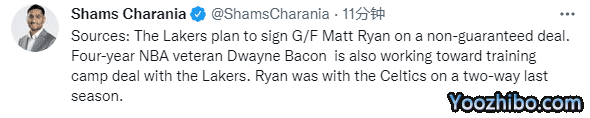 178直播09月26日,湖人官方裁掉一人后连续签下两名球员,据名记Shams报道,湖人计划以非保障合同签下马特-瑞安,还用训练营合同签德维恩-培根;湖人20人大名单满额,三巨头领衔冲冠。