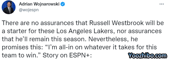 178直播09月25日,ESPN名记沃纳罗斯基撰文报道,即使没有获得留队保证和首发保证,威少仍旧表示:我会全力以赴帮助湖人获胜;这就是深陷交易流言之中时,威少的心态,甘愿担任任何角色,仍相信湖人三巨头不可阻挡。