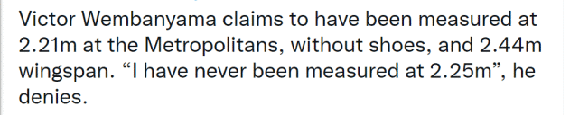 此前有报道称,文班亚马的裸足身高达到2米25,臂展是2米44。对此,文班亚马本人澄清道:“我在俱乐部的裸足身高量到2米21,臂展是2米44,我从来没量到过2米25。”虽然比外界传言的身高矮了4公分,但这也显得他的臂展更加可怕了。