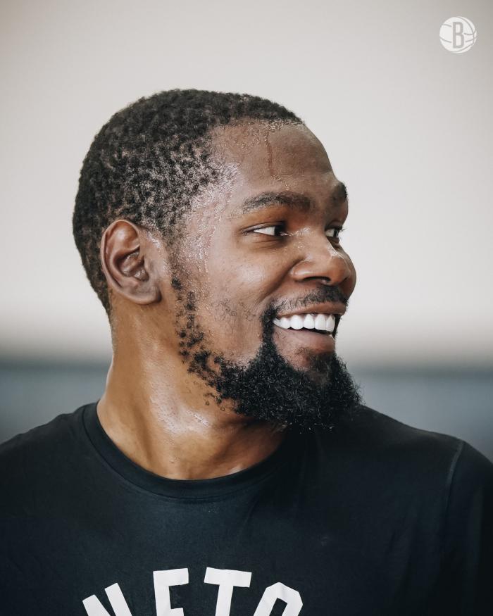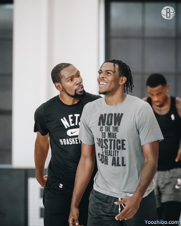 杜兰特身穿篮网训练服,归队训练并且与托马斯击掌,杜兰特还看着夏普说了一些话(你猜KD说了什么话),KD表情抢镜,夏普一脸笑容很开心。