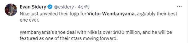 据报道,文班亚马和耐克签下的球鞋代言合同金额超过1亿美元,Evan Sidery表示文班logo是耐克有史以来最好的logo之一,未来他将会成为耐克的门面球星之一。