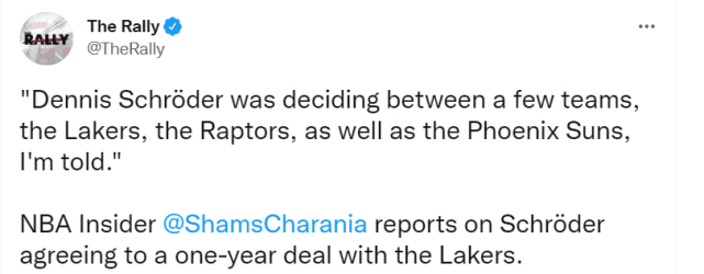 178直播09月17日,名记Shams报道称,施罗德计划和湖人签下1年264万美元的合同,再次为这支球队效力,为此他拒绝了猛龙、太阳等队的邀请。施罗德本人也第一时间更新社媒,重回湖人后首次发声。名嘴Bill Simmons依然看衰湖人前景,认为得到施罗德湖人也只是西部9号种子。