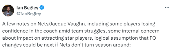 据篮网随队记者Ian Begley报道,在篮网最近的挣扎中,一些球员对沃恩失去了信心。消息人士透露,篮网内部有人担心沃恩会妨碍他们得到顶级球员的机会。