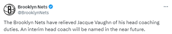 篮网官方声明,球队已经解雇了主帅沃恩,临时主帅将在不久后任命;随后篮网总经理肖恩-马克思表示:这是一个非常艰难的决定,但我们认为这符合球队未来的最大利益。