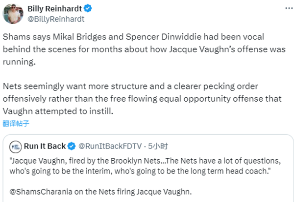 shams还透露:多个球员,包括丁威迪和布里奇斯,他们在几个月来在更衣室里经常发声,关于球队的进攻。他们认为沃恩的进攻中有许多是不合适的,缺乏体系。