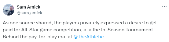 全明星正赛不仅早早失去悬念,而且变成一场三分大赛,两队加起来投了168次三分球;全明星赛被批无聊且没有竞争性,据名记Sam Amick报道,消息人士透露,球员们私下表示想在全明星赛中获得与季中锦标赛一样的报酬。