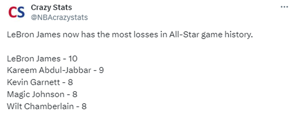 据统计,这是詹姆斯生涯第10次输掉全明星赛,超越贾巴尔(9次)成为史上输掉全明星最多的球员,另外张伯伦、加内特和魔术师约翰逊均是8次输掉全明星,排在历史第三多。