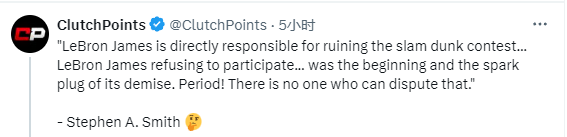 今日,名嘴A-史密斯还炮轰詹姆斯毁掉了扣篮大赛,A-史密斯表示:詹姆斯是毁掉扣篮大赛的直接责任人,每一位弹跳力出色的球员、每一个空中漫步者、攻筐天才都对参加扣篮大赛的机会垂涎欲滴,当詹姆斯说不参加时,一切就结束了。从那时起,后来的球星们都不愿意参加扣篮大赛了。是詹姆斯首先拒绝参加扣篮大赛,这是这项比赛走向消亡的开端和导火索。事情就是这样!这是不容置疑的!