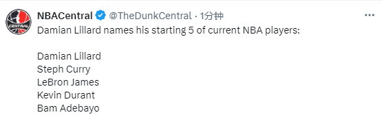 记者问:若你创造一支球队,你心目中的现役首发阵容是谁?利拉德表示:我,勒布朗、库里、凯文-杜兰特,还有阿德巴约。