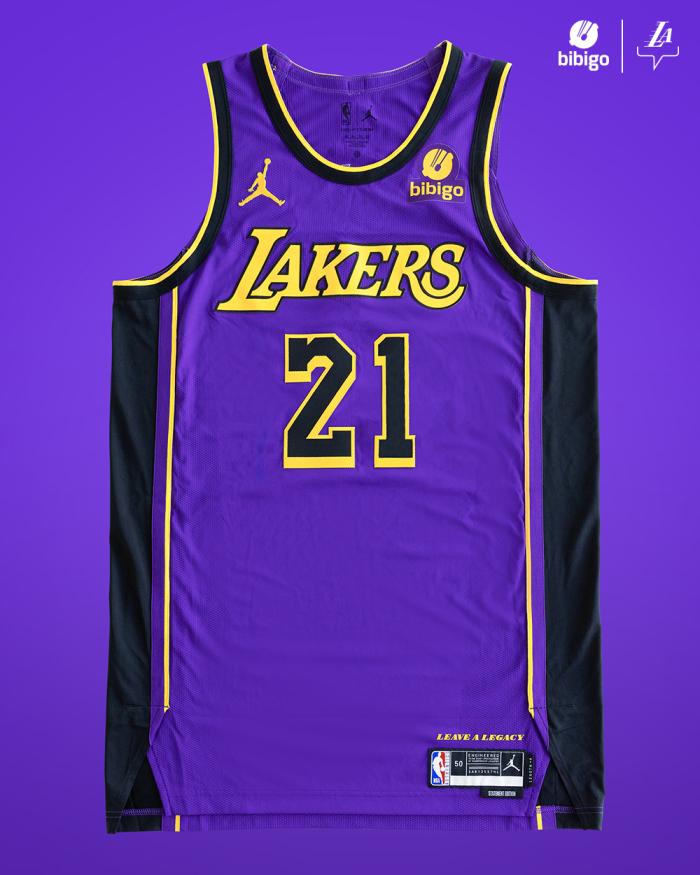 湖人新赛季主题版球衣,以紫色为底色,也就是球衣的主体颜色,边上镶着黄色;球衣前面印着湖人队logo,球员的号码以及赞助商logo,球衣的领口出印着数字17,这代表湖人队史已经夺得17座总冠军。