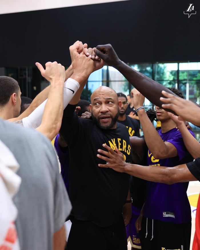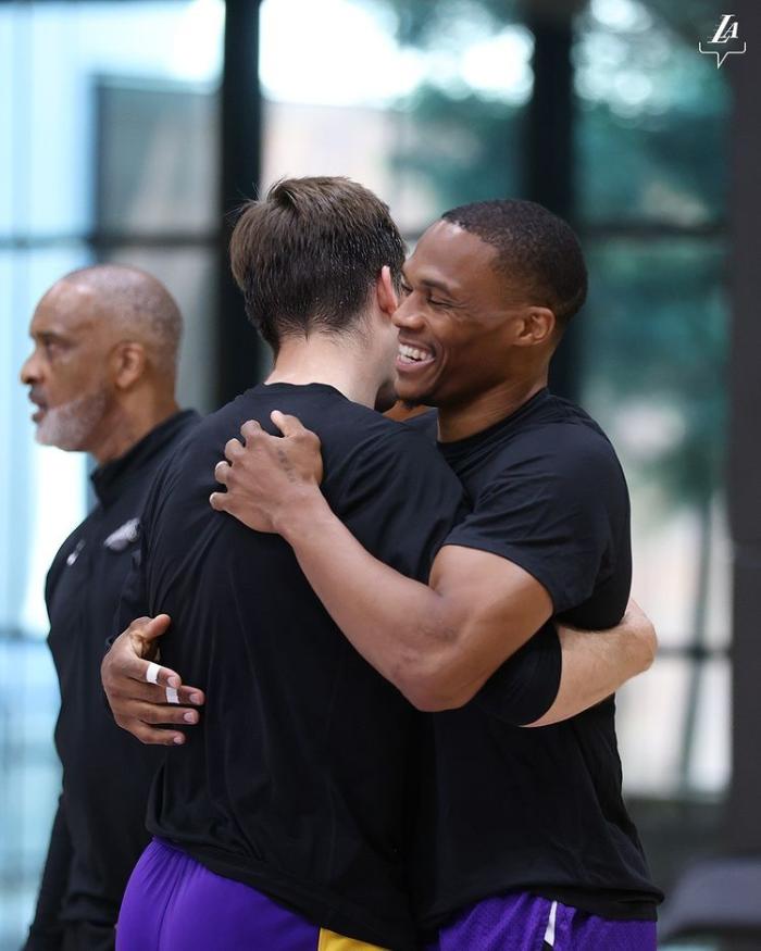 湖人官方晒出球队最新的训练照,新帅哈姆与全队一起碰拳鼓劲,贝弗利搂着安德森亲切交流,威少抱着里夫斯开怀大笑,湖人官方配文写道:团结在一起。