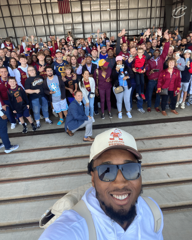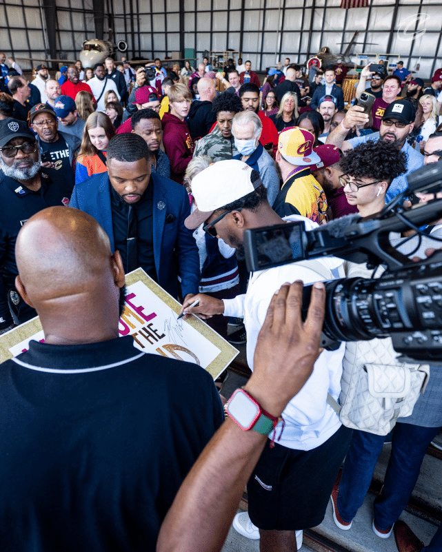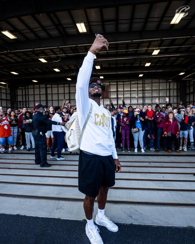 米切尔乘坐包机从纽约飞抵克利夫兰,随后坐球队安排的专车抵达发布会。很多骑士球迷早早聚集在门口,欢迎米切尔的到来。米切尔和主帅比克斯塔夫拥抱致意后,也不忘和球迷互动,为他们签名并自拍大合影。