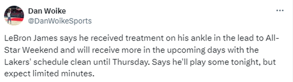 詹姆斯表示他会上场出战,但预计上场时间受限;谈到今日自己的出场时间,詹姆斯表示:我今天肯定打不了整场比赛,我的脚踝在全明星周末之前接受了治疗,过去几天一直在接受治疗,全明星周末剩余的几天假期,我也会继续接受治疗。