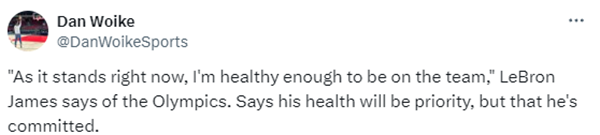 谈到是否会参加今夏的巴黎奥运会,詹姆斯表示:就目前而言,我的健康状况足以让我成为美国男篮奥运队的一员。即便之后还有漫长的赛季,伤病可能会成为影响因素。健康永远是最重要的,但我已经承诺了。我有决心,我就会全身心投入。