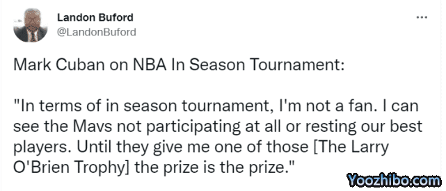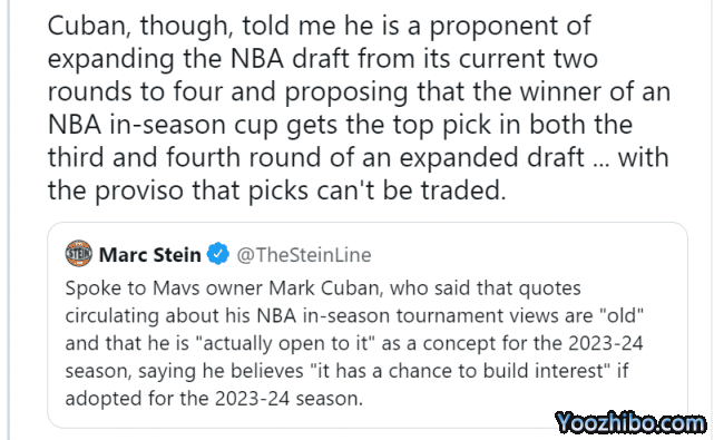 现在,库班表示自己的想法已经发生了变化。他希望联盟通过这一机会来同时变革选秀机制。季中锦标赛的获胜队得到后两轮选秀的最佳签位,但这个签不能交易。联盟目前还没有确定为季中锦标赛获胜的球队提供怎样的奖励,2021年9月时,Shams报道称,联盟讨论过为获胜球队的每一位球员提供100万美元奖金的可能。