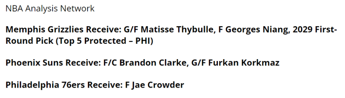 交易方案如下,灰熊得到塞布尔+尼昂+29年首轮签(来自于76人,前五保护),太阳得到克拉克+科尔克马兹,76人得到克劳德。这笔交易方案对于76人来说,相当于用塞布尔+尼昂+科尔克马兹+29年首轮签,4换1得到克劳德。76人在4号位已经拥有塔克、哈里斯的情况下,为何记者还要建议76人追求克劳德?其实76人管理层已经给出答案,他们今夏的签约,大部分是火箭旧将,3D类型球员,用皮尔西的话说,任何能投能防的球员,都非常适配哈登,而这套零换整方案,有助于76人在季后赛关键时刻解决球队难题。