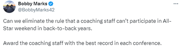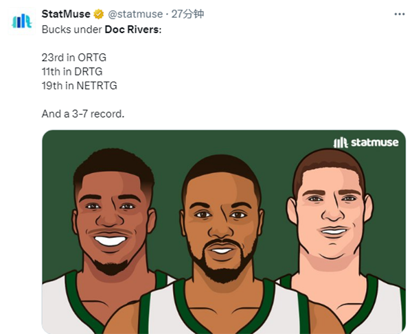 里弗斯执教雄鹿后战绩糟糕,NBA薪资专家Bobby Marks发推写道:我们能否取消教练不能连续两年执教全明星的规定? 应该奖励东西部战绩最佳的教练组。