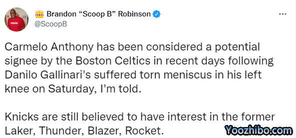 现在凯尔特人和尼克斯都有意签约安东尼,绿军有意甜瓜是因为此前加里纳利在世预赛比赛中扭伤膝盖,确诊为左膝半月板撕裂,免遭十字韧带撕裂的重伤。