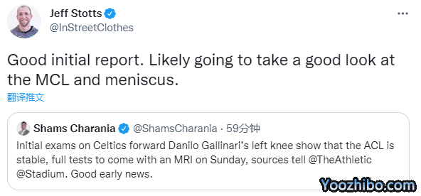 加里纳利膝伤的初步检查结果出炉,据名记shams报道,他的左膝签交叉韧带没有撕裂,将在明天接受核磁共振检查,从而进一步确定伤情;对于医学专家Jeff Stotts表示,这是一个好消息,但他可能遭遇膝关节内侧副韧带和半月板的伤病。