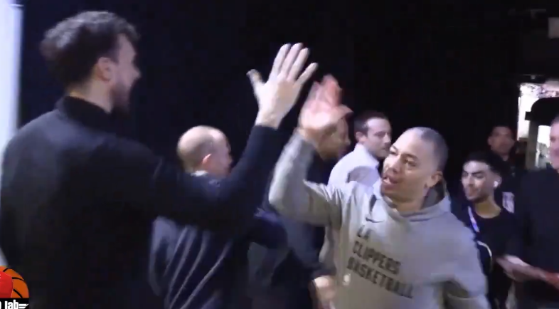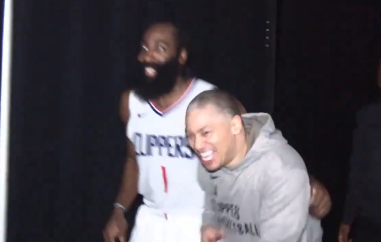 卢帅抨击裁判后迎接快船众将,与威少、小卡、乔治等快船球员一一击掌庆祝,多次高呼:伟大的胜利。看到哈登跑过来,卢帅赶紧走过去与哈登击掌,并且熊抱哈登,两人都咧嘴大笑十分开心。