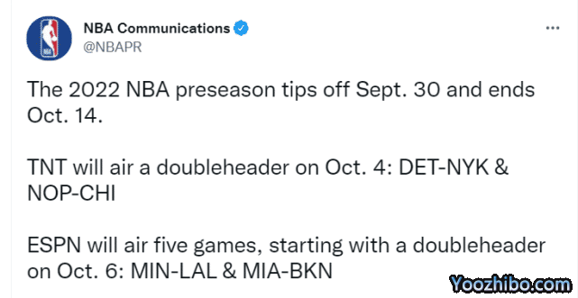 178直播08月26日讯 ,NBA官方公布了2022-23赛季的季前赛完整赛程。其中一些比赛令人关注,比如勇士10月10日(北京时间,下同)将在主场迎战湖人,詹姆斯有望对上库里。篮网将连续对阵76人、热火和雄鹿,杜兰特、欧文、西蒙斯的联手效果值得期待。