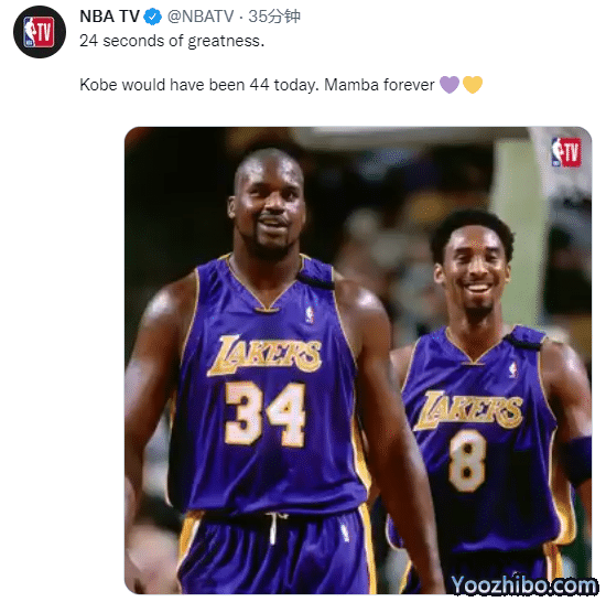 NBA TV晒出科比生涯最经典的24个画面,配文写道:科比44岁生日快乐,曼巴永恒;Clutch Points晒图并且发推写道:比赛不一样了,但我们还是想高喊你的名字;科比,生日快乐;Bleacher Report用科比身穿湖人球衣的赛场照,合成曼巴永恒的照片,配文写道:科比永远都在我们的心中。