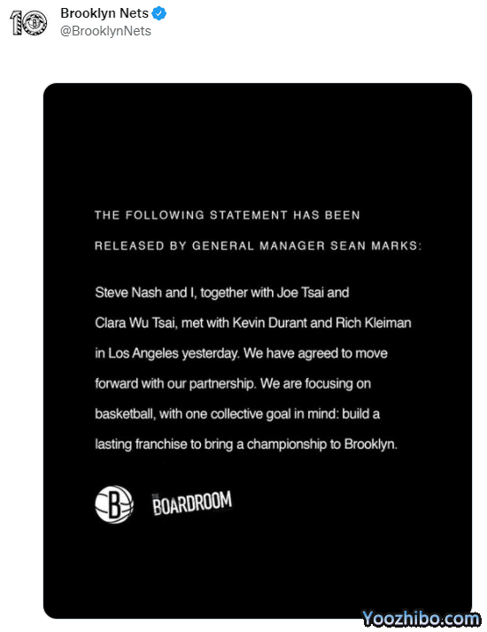 178直播08月24日讯 时隔54天,杜兰特闹剧正式结束!篮网官方发布声明,杜兰特决定留守篮网,篮网总经理肖恩-马克斯声明:蔡崇信、纳什、我、杜兰特和杜兰特的经纪人已于昨日进行了会面,我们决定继续我们的合作,我们专注于篮球,有着共同的目标:建立一个稳定的球队,为布鲁克林带来总冠军。