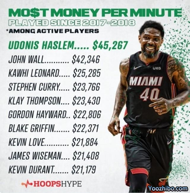 数据显示,从2017-18赛季至今,哈斯勒姆每上场1分钟,就能赚到45267美元,现役球员排名第一。位居第二的是沃尔,每上场1分钟能赚到42346美元。小卡排名第三,每上场1分钟能赚到25285美元。