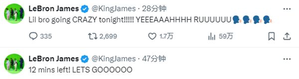 湖人众将带队轻松击败爵士,詹姆斯看嗨了,先是发推写道:我们冲,比赛还剩12分钟;之后发推盛赞八村,发推写道:耶耶耶,我的小兄弟今晚打疯了。
