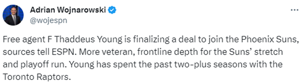 178直播02月14日讯 ,据ESPN名记woj报道,太阳将签下老将赛迪斯-杨,填补阵容以及增强球队的前场深度;太阳队记确认这笔签约,且报道太阳还有意签下加里纳利;太阳新17人名单出炉,三巨头领衔冲击总冠军。
