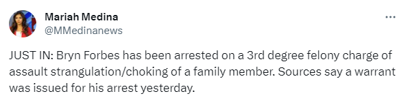 据悉,福布斯因殴打一名家庭成员,被指控犯了对家庭成员的袭击、勒死或使其窒息的罪名,昨日警方对他发出了逮捕令并与今天将其逮捕。