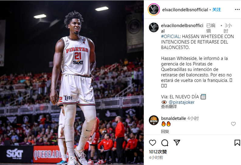 波多黎各联赛球队克布拉迪亚斯海盜队官方今日宣布,哈桑-怀特塞德已通知球队管理层,他计划退役,这是他不前往球队报到的原因。