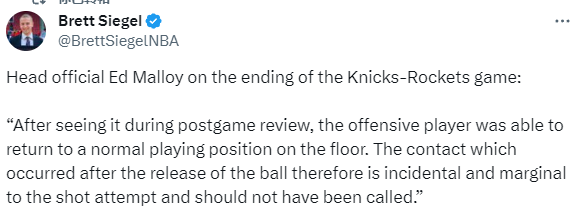 霍勒迪0.3秒三分造犯规并且罚球绝杀引争议,究竟布伦森犯规了吗?赛后本场比赛的主裁判马洛伊承认,最后这个判罚是错判,马洛伊表示:赛后我们看了回放,那个接触发生于出手之后,并且是轻微的,不应该是一个犯规。