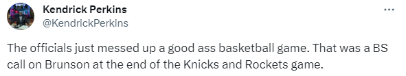 名嘴帕金斯赛后第一时间怒喷裁判:裁判们刚刚把一场精彩的篮球赛搞砸了,在尼克斯和火箭比赛最后时刻对布伦森的吹罚真的很扯!