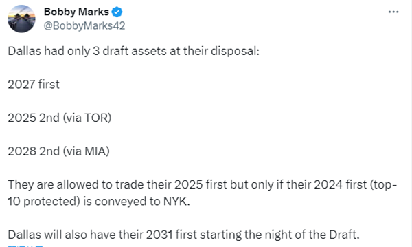 据薪资专家Bobby Marks统计,独行侠在该笔交易中送出了他们未来七年唯一可交易的首轮,目前独行侠还有2个次轮签可交易,2025年(来自猛龙)和2028年(来自热火)。