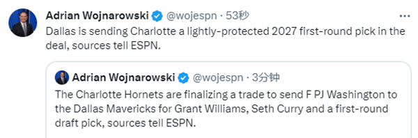 独行侠引援加福德后继续操作,他们又和黄蜂达成交易——独行侠送出格兰特-威廉姆斯、赛斯-库里和1个2027年的前二顺位保护首轮签,从黄蜂换来PJ-华盛顿+2个次轮签。