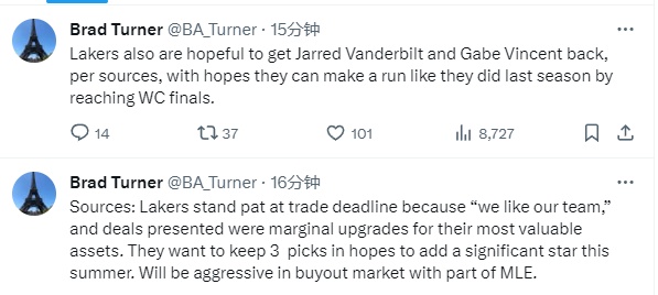 《洛杉矶时报》记者Brad Turner报道,湖人在截止日前按兵不动,是因为他们认为“我们喜欢现有阵容”,而且他们最有价值的资产也仅能换来微不足道的升级。他们希望能留下三个首轮,并在今夏交易得到一位关键球星。而且会积极地在买断市场中用中产合同寻求补强。”