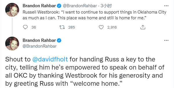 在剪彩仪式上,俄城市长给了威少一把城市钥匙,并且告诉威少他有资格代表雷霆发言;威少领取钥匙后表达了自己对这座城市的感谢,他说:我想尽我所能地继续去支持俄克拉荷马城。这个地方曾经是我的家,现在仍然是我的家!