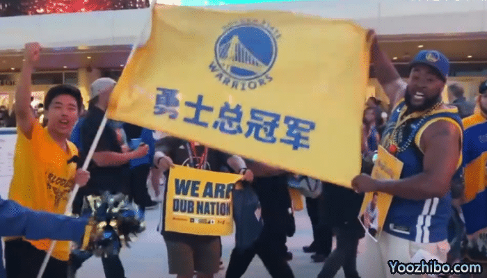 勇士的主场出现了很多一面“神秘大旗”,那就是印有“勇士总冠军”的旗帜。这面旗子出现之后,球迷们也都沸腾了,纷纷上前高喊中文的“勇士总冠军”,其他的球迷们也过来,一起庆祝和欢呼,气氛满分。